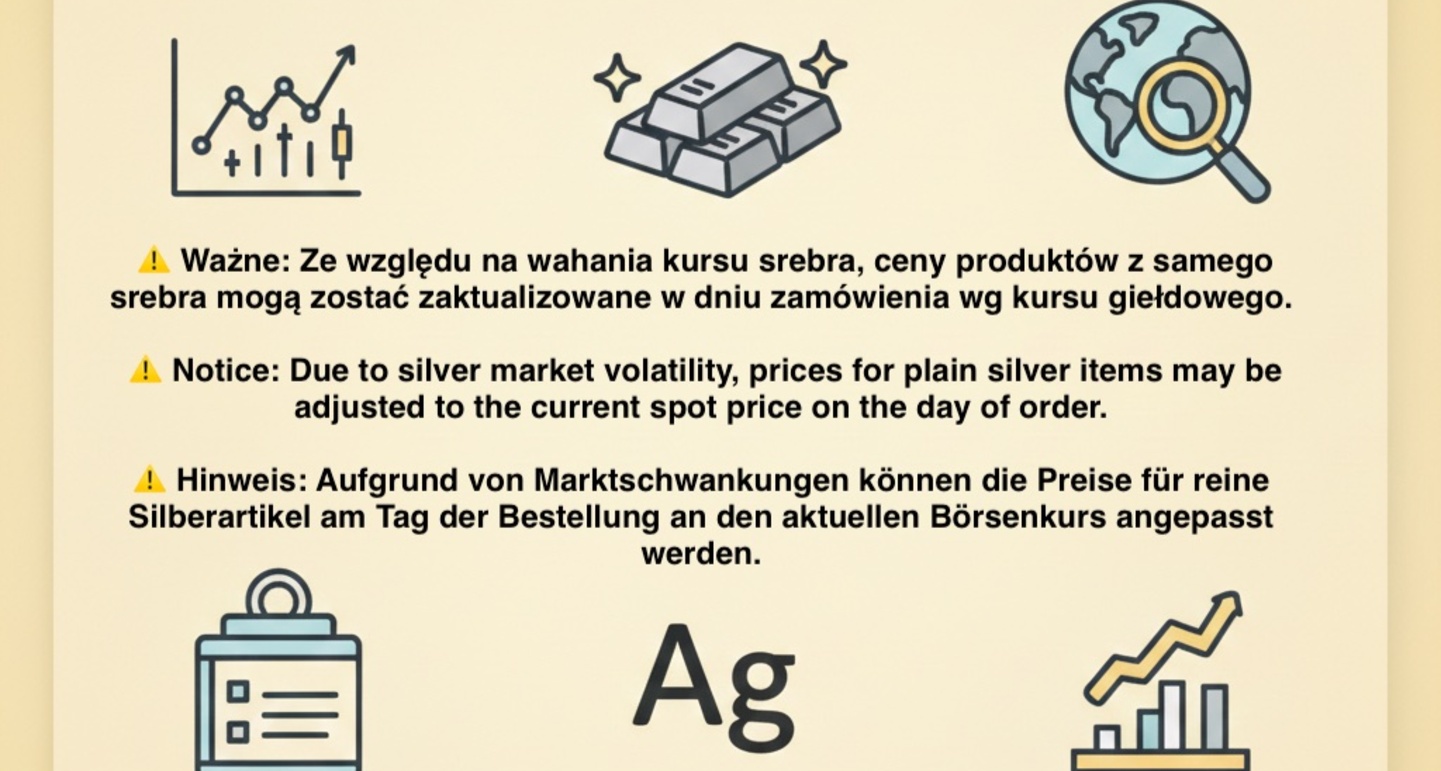 Ważna informacja dotycząca cen Szanowni Klienci, Ze względu na dużą dynamikę kursu srebra na rynkach światowych, ceny produktów na naszej platformie mogą nie być aktualizowane w czasie rzeczywistym. W przypadku zamówień na produkty wykonane...więcej »
