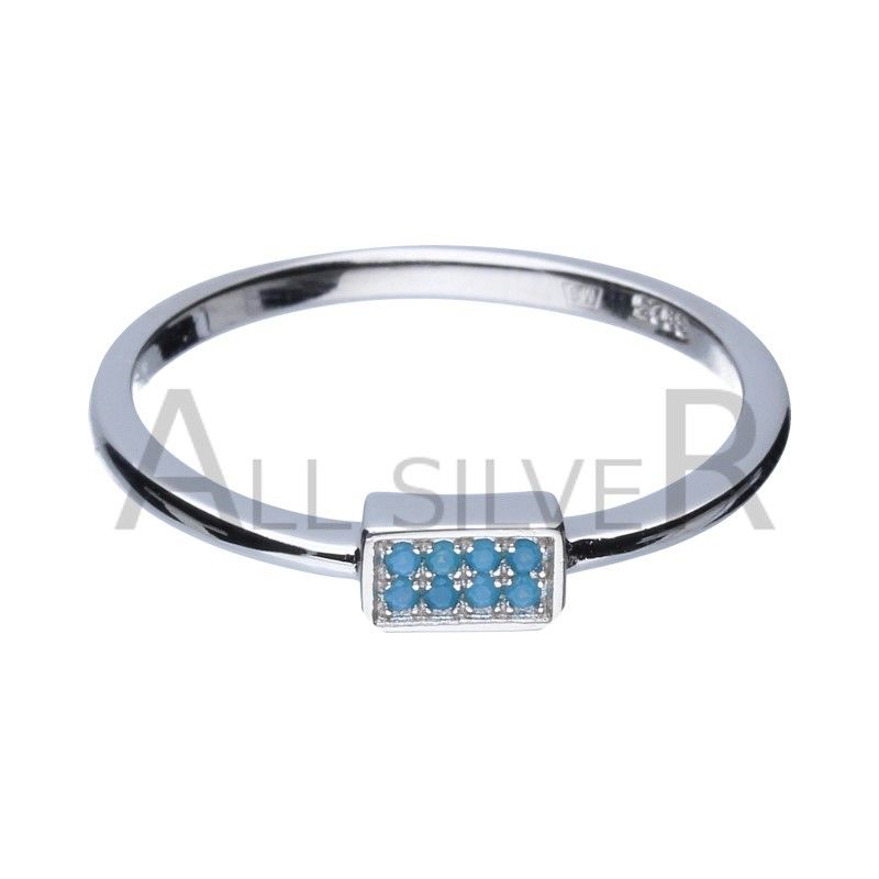 DELIKATNY PIERŚCIONEK SREBRNY 925 RODOWANY, OZDOBNY ELEMENT W KSZTAŁCIE PROSTOKĄTA, CYRKONIE W ODCIENIACH TURKUSU I BŁĘKITU. WYMIARY OZDOBNEGO ELEMENTU 3MM X 6MM