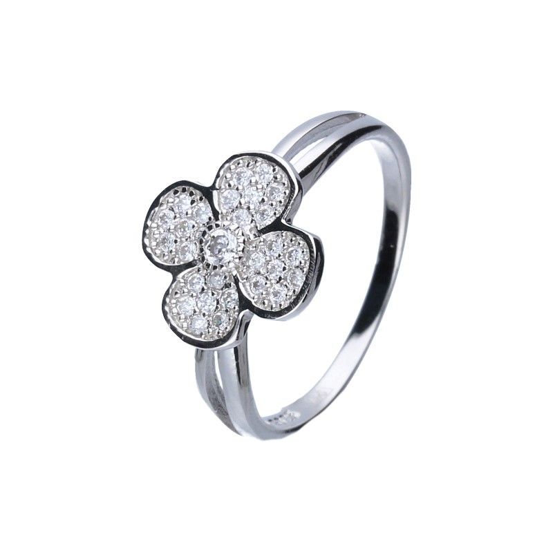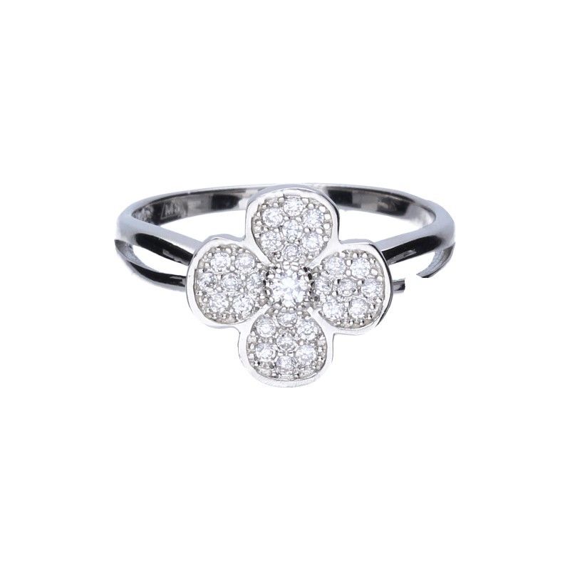 PIERŚCIONEK SREBRO PRÓBY 925 RODOWANE, CYRKONIE OSADZONE METODĄ MICROSETING, KWIATUSZEK O WYMIARACH 11mm X 11mm.