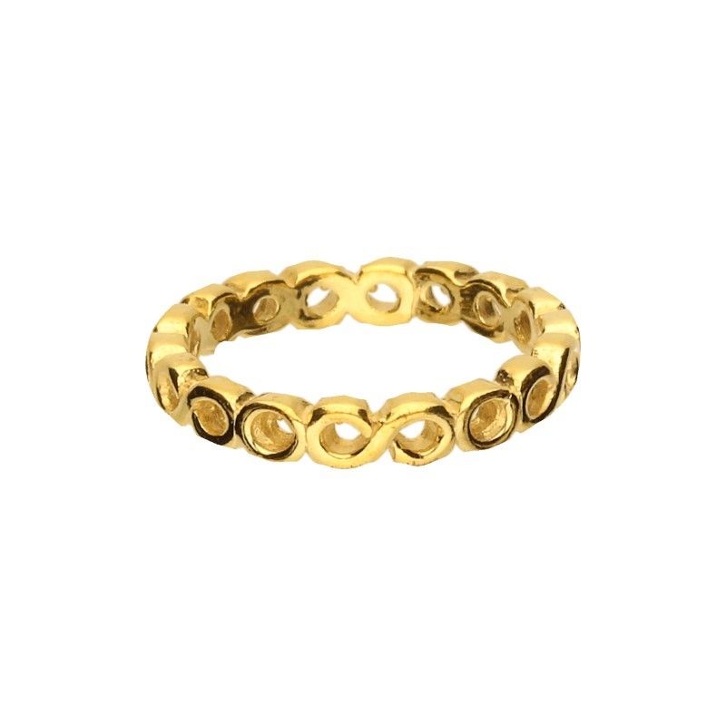 PIERŚCIONEK TYPU OZDOBNA OBRĄCZKA, SREBRO PRÓBY 925 POZŁACANE 24 KARATOWYM ZŁOTEM, AŻUROWY WZÓR POŁĄCZONYCH ZE SOBĄ NIESKOŃCZONOŚCI.