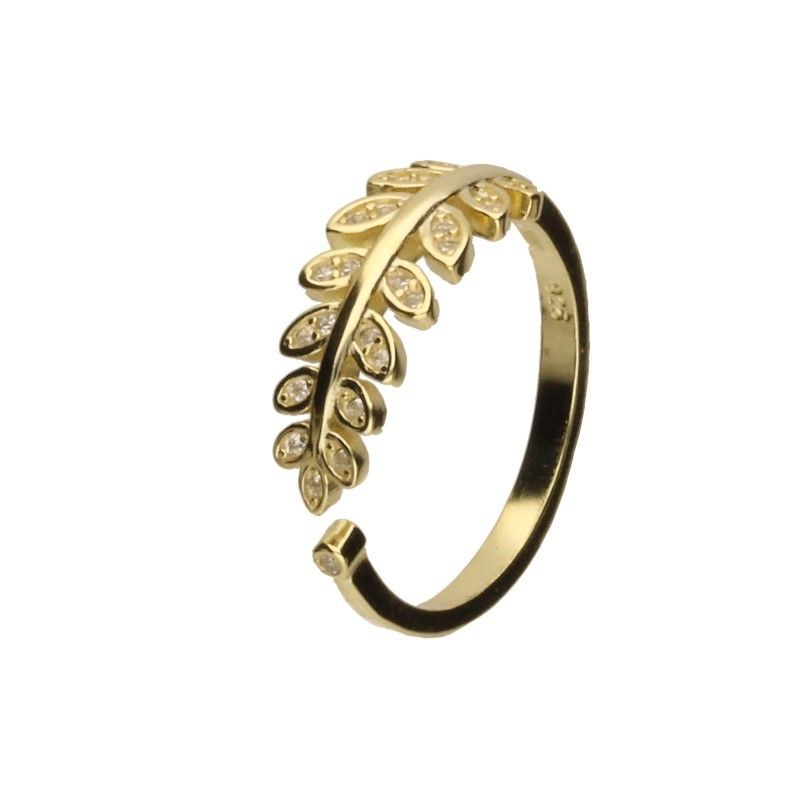 PIERŚCIONEK SREBRO PRÓBY 925 POZŁACANE 24 KARATOWYM ZŁOTEM, BIAŁE CYRKONIE, GAŁĄZKA, LIŚCIE, WYMIARY MOTYWU 17mm X 7mm.