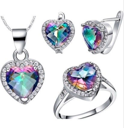 KOMPLET KOLCZYKI NA ANGIELSKIM ZAPIĘCIU, ZAWIESZKA I PIERŚCIONEK, KAMIEŃ GŁÓWNY TURMALIN OTOCZONY BIAŁYMI CYRKONIAMI, SERCE, W KOMPLECIE PIERŚCIONEK W ROZMIARZE 12.
