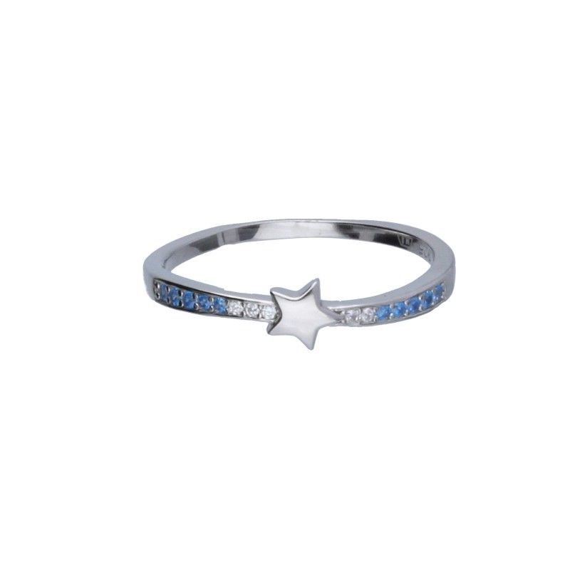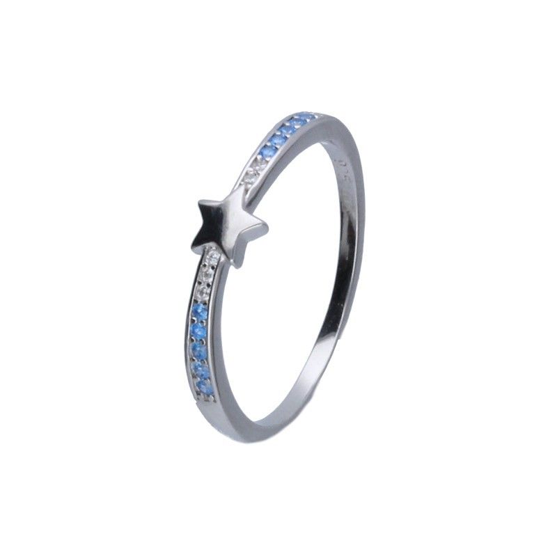 PIERŚCIONEK SREBRO PRÓBY 925 RODOWANEM CYRKONIE W KOLORE NIEBIESKIM I BIAŁYM, GWIAZDKA O WYMIARACH 4mm X 5mm.
