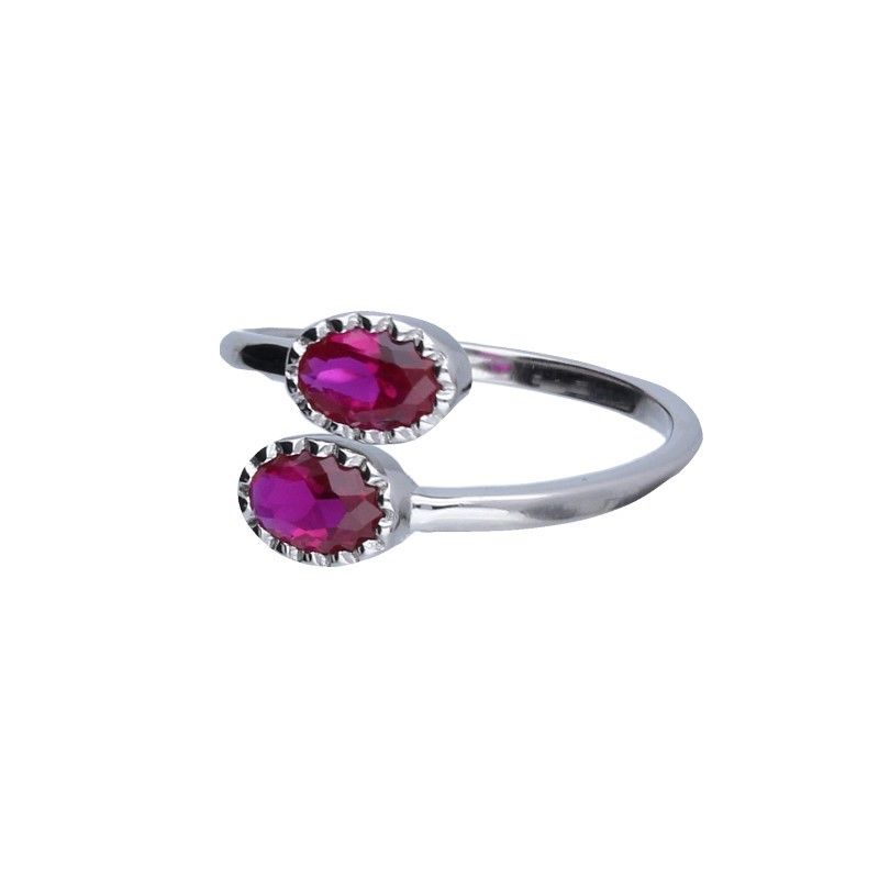 PIERŚCIONEK OTWARTY, SREBRO PRÓBY 925 RODOWANE, OWALNE CYRKONIE W KOLORZE FUKSJI O WYMIARACH 5mm X 7mm.