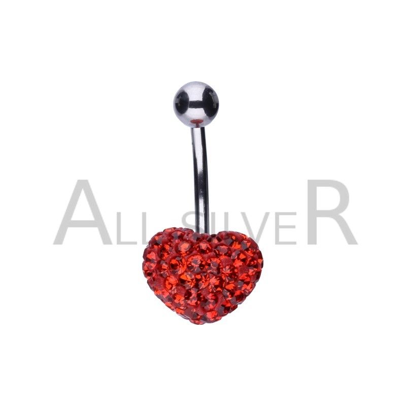 KOLCZYK DO PĘPKA, POŁĄCZENIE SREBRA PRÓBY 925 ZE STALĄ CHIRURGICZNĄ, SERCE 11MM Z KRYSZTAŁKAMI W KOLORZE RUBINOWYM.