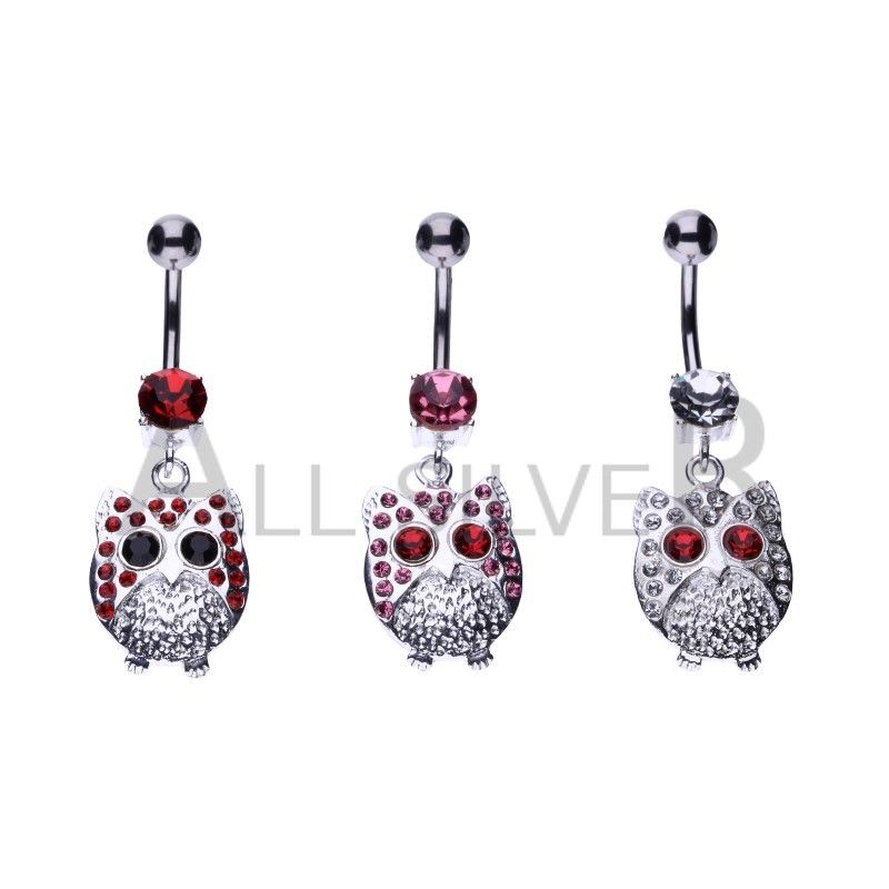 KOLCZYK DO PĘPKA, SOWA, POŁĄCZENIE SREBRA PRÓBY 925 ZE STALĄ CHIRURGICZNĄ, CYRKONIE W KOLORZE BIAŁYM I RUBINOWYM.